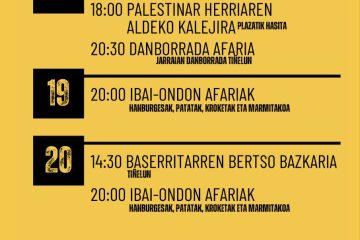 Altamirako eta Gantxurizketako jaien ondoren hemen ditugu Santakrutzak! Irailak 13an hasiko gara Truk txapelketarekin eta gero Palestinaren aldeko manifestazioan parte hartuko dugu. Eguna bukatzeko, afalostean, danborra joko dugu. Gogoratu 19 eta 20an afariak emango ditugula. Read more